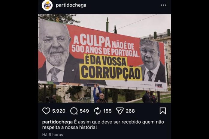 O líder do Chega afirmou no discurso, acompanhado do outdoor com a foto de Lula, que esses países não podem justificar a própria corrupção e pobreza culpando a história de Portugal.
