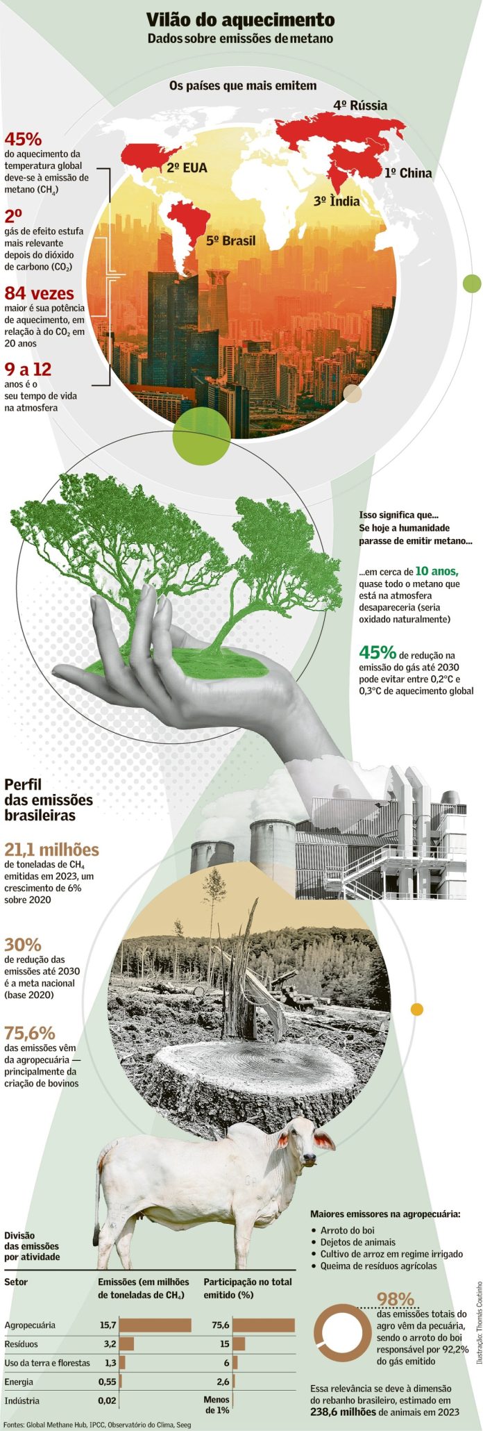 A agropecuária responde por 75,6% das emissões brasileiras de CH4, a maior parte proveniente da pecuária. As 15,7 milhões de toneladas de metano emitidas pelo rebanho bovino do país em 2023, segundo maior do mundo, superaram as de todos os gases de efeito estufa gerados na Itália no mesmo ano, segundo o Observatório do Clima.