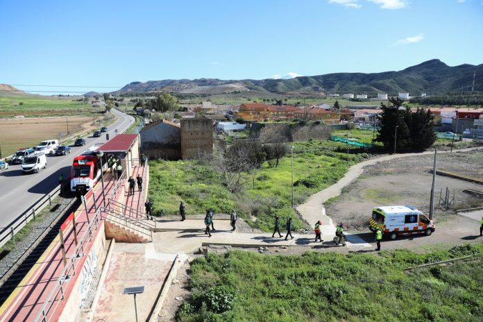 Polícia espanhola e equipes de resgate trabalham na área onde um trem de passageiros colidiu com um guindaste, perto da cidade portuária de Cartagena, na região de Múrcia, na Espanha — Foto: Reuters/Loyola Perez de Villegas Muniz