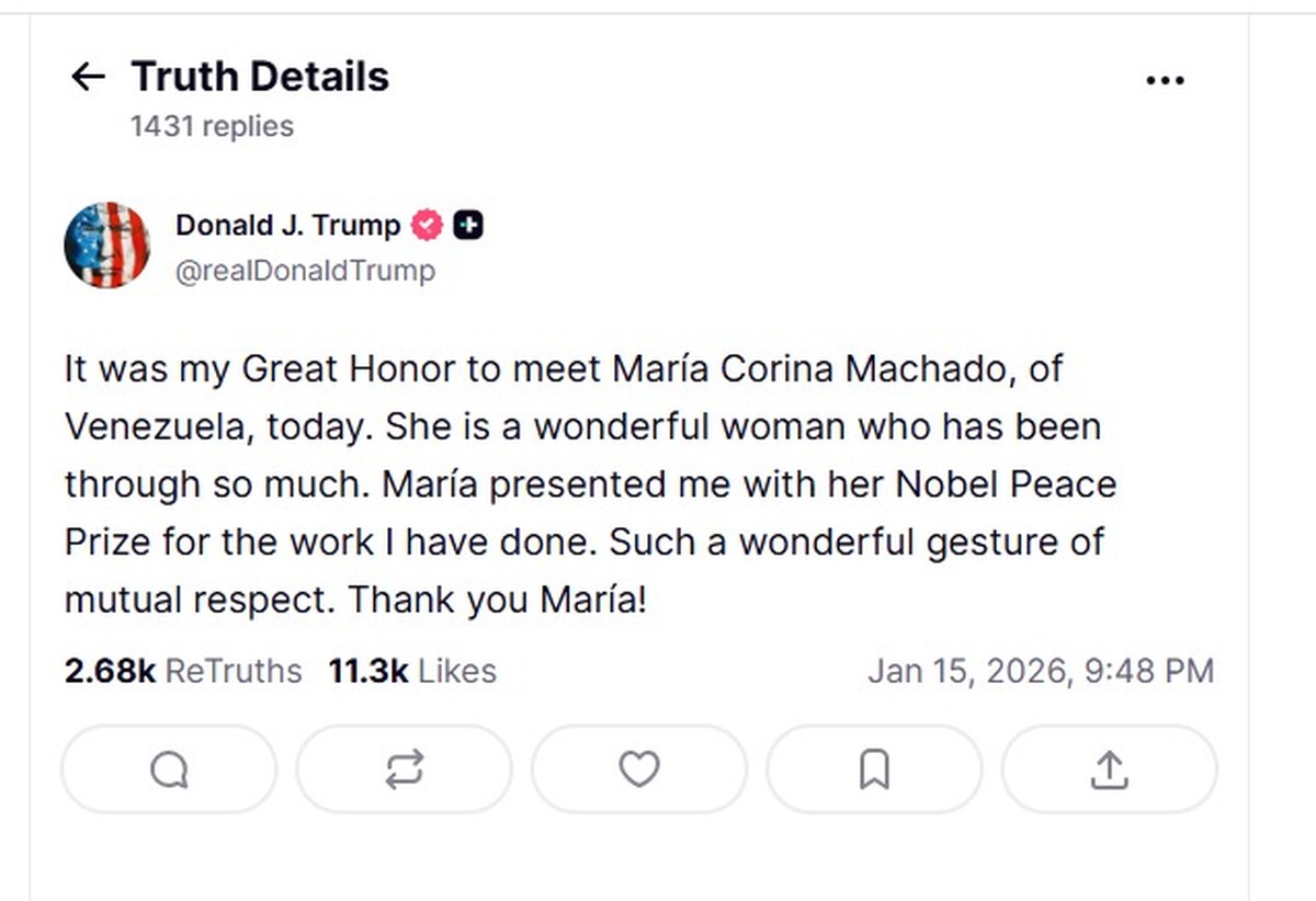 A líder da oposição venezuelana, María Corina Machado, entregou sua medalha do Prêmio Nobel da Paz ao presidente dos Estados Unidos, Donald Trump, nesta quinta-feira, durante uma reunião na Casa Branca, em uma tentativa de ganhar influência sobre como o presidente moldará o futuro político do país sul-americano. Um funcionário da Casa Branca confirmou que Trump pretende ficar com a medalha. Em uma postagem em rede social na noite de quinta-feira, Trump escreveu que María o presenteou com seu Nobel pelo trabalho que ele realizou, descrevendo o ato como um gesto maravilhoso de respeito mútuo. Machado, que classificou a reunião como “excelente”, afirmou que o presente foi um reconhecimento ao compromisso de Trump com a liberdade do povo venezuelano.
